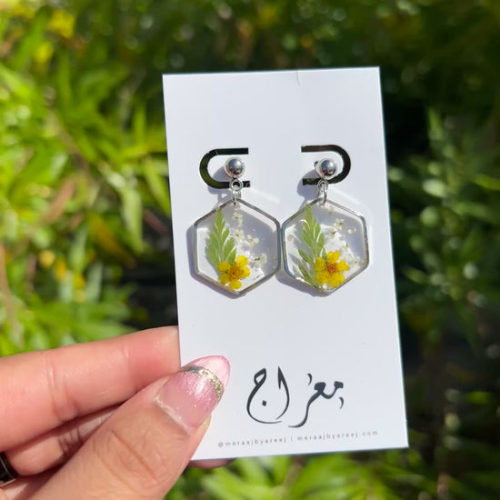 These delicate hexagon studs feature real pressed flowers — a soft yellow plum blossom, airy Queen Anne’s Lace, and a graceful fern leaf, lovingly preserved in resin. Minimalist yet enchanting, they bring the elegance of nature to your everyday style.