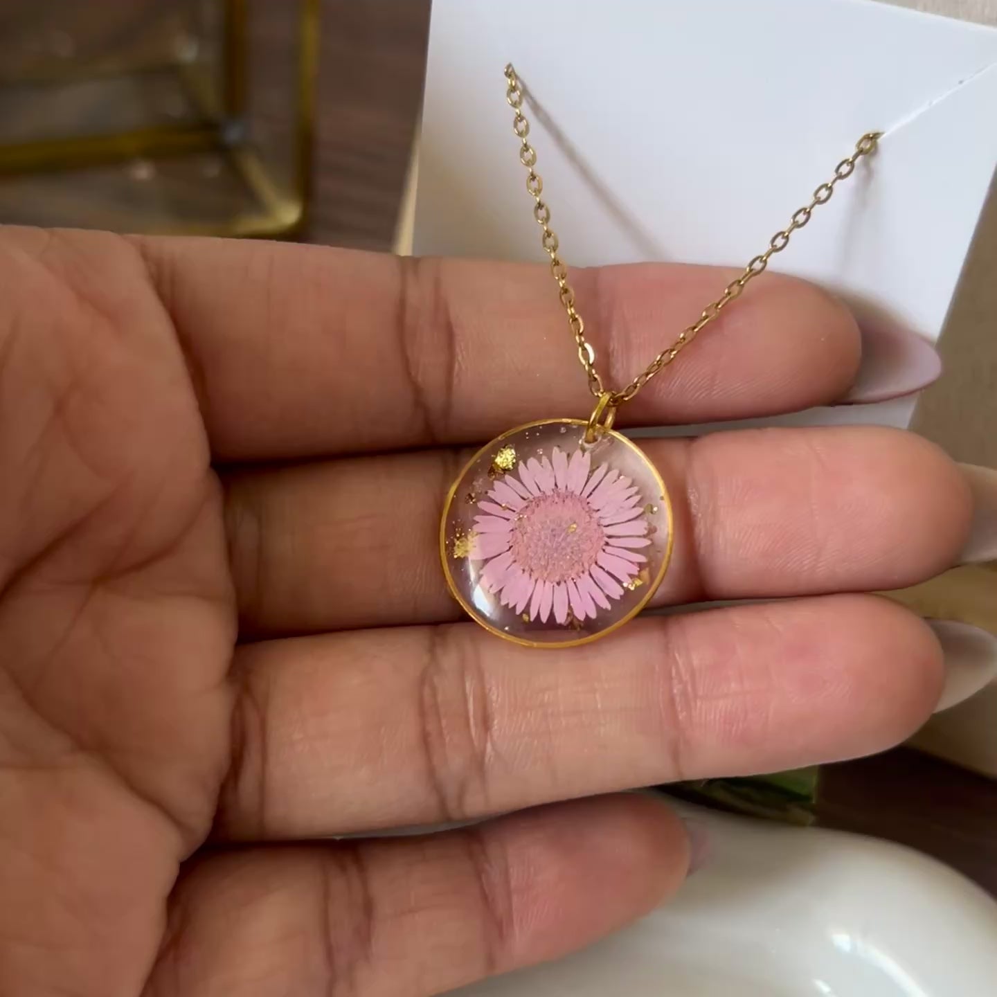 This necklace features a real pink aster flower, pressed and preserved in resin, set in a round bezel with a gold stainless steel chain.